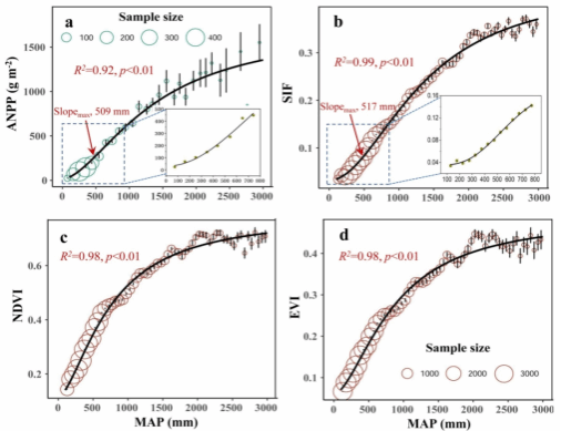 图1 植被生产力指标(即地上净初级生产力(a)、太阳诱导叶绿素荧光SIF(b)、归一化差异植被指数NDVI(c)和增强植被指数EVI(d))沿年均降水量(MAP)梯度上的空间变化(与微观经济学理论预测的逻辑斯蒂函数形式一致)。