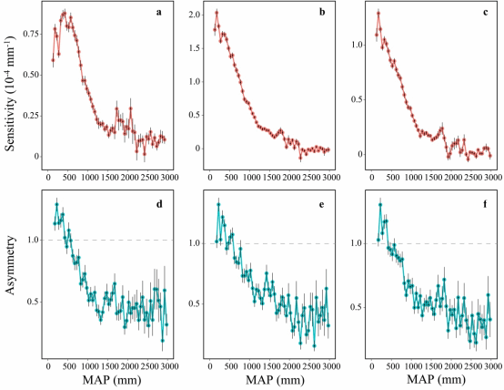 图2 植被生产力指标(即太阳诱导叶绿素荧光SIF(a, d)、归一化差异植被指数(b, e)和增强植被指数(c, f))的降水敏感性和对降水改变的非对称性响应沿降水梯度的空间变化。