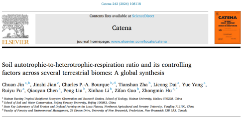 近日,公司生态服务功能监测与评估团队在国际著名期刊CATENA发表题为“Soil autotrophic-to-heterotrophic-respiration ratio and its controlling factors across several terrestrial biomes: A global synthesis”的研究论文(https://www.sciencedirect.com/science/article/abs/pii/S0341816224003151)。该论文的第一作者为青年教师靳川,通讯作者为胡中民教授,tyc234cc太阳成集团为第一单位。