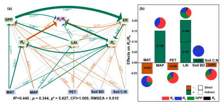 土壤自养和异养呼吸(Ra和Rh)对碳循环和全球气候变化有着不同的影响。然而,过去的大部分研究集中在Ra或Rh单一变量上,常常忽略了它们之间的关系。尤其是,目前对Ra和Rh在不同环境条件下的变化以及在全球尺度上的了解还不够充分。因此,探究自养和异养呼吸的比率(Ra/Rh)变化对于我们理解土壤碳循环至关重要,还可为了解土壤呼吸对全球气候变化和其他自然和人为干扰的响应提供新的视角。