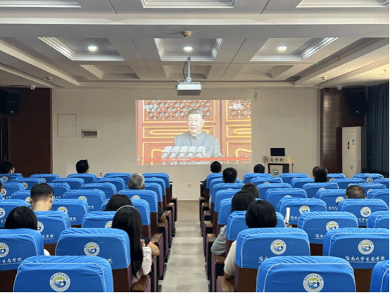 上午9时整,大会正式开始。学院领导班子、党总支委员等集中在207报告厅收看。