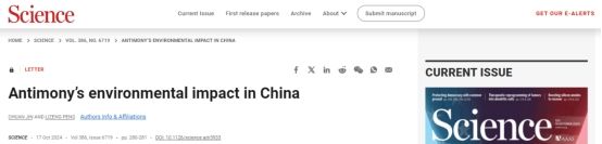 近日,公司生态服务功能监测与评估团队成员靳川博士联合山东省农业科学院彭立增研究员,在《Science》上发表题为“Antimony’s environmental impact in China”的Letter评述文章。靳川博士为该文第一作者,彭立增研究员为共一/通讯作者。该文章探讨了中国锑(Sb)污染的现状及其对生态环境和人类健康的威胁,并呼吁通过在环境介质、生物体中进行广泛的数据收集,优先开发生物传感器并结合生物修复技术来控制这一重金属污染,为化学环境污染管理提供了宝贵的见解和策略。